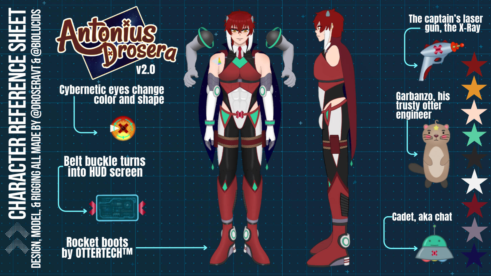 Character Designer: SelfAntonius Drosera (アントニウス・ドロセラ), more often referred to as just Drosera, is a male, American, Space Mafioso VTuber. When he’s not committing space crimes, he’s also a model as his day job. His primary language is English, but he knows some Spanish. He is known for his pop culture commentary and gaming content.