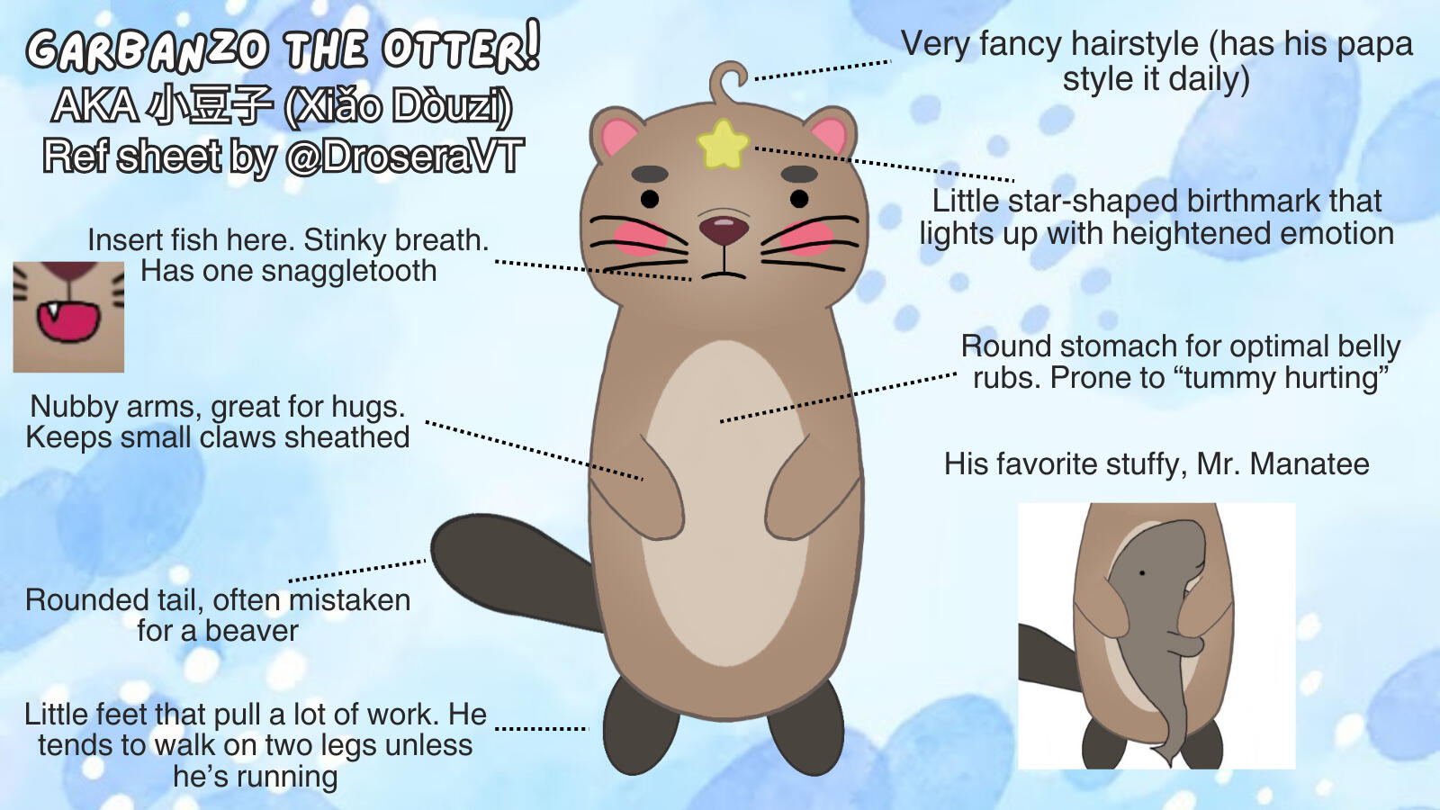 Character Designer: DroseraXiǎo Dòuzǐ (アントニウス・ドロセラ), better known as his American name Garbanzo, is a male, Chinese, Asian Small-Clawed Otter VTuber. He is very easy-going, loves fish, and is extremely smart.